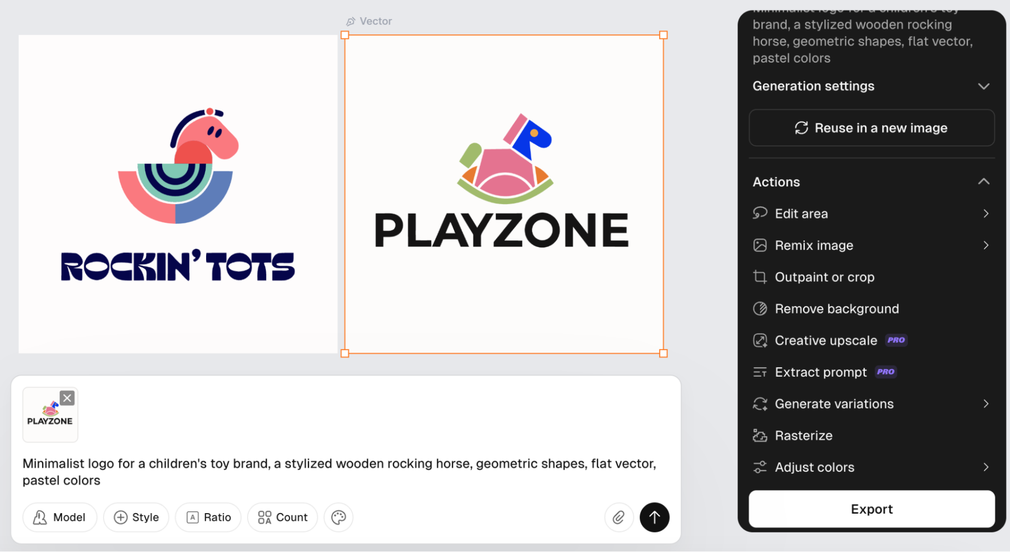 - Что умеет: генерирует логотипы, иконки, векторные иллюстрации и целые наборы элементов в едином стиле на бесконечном холсте