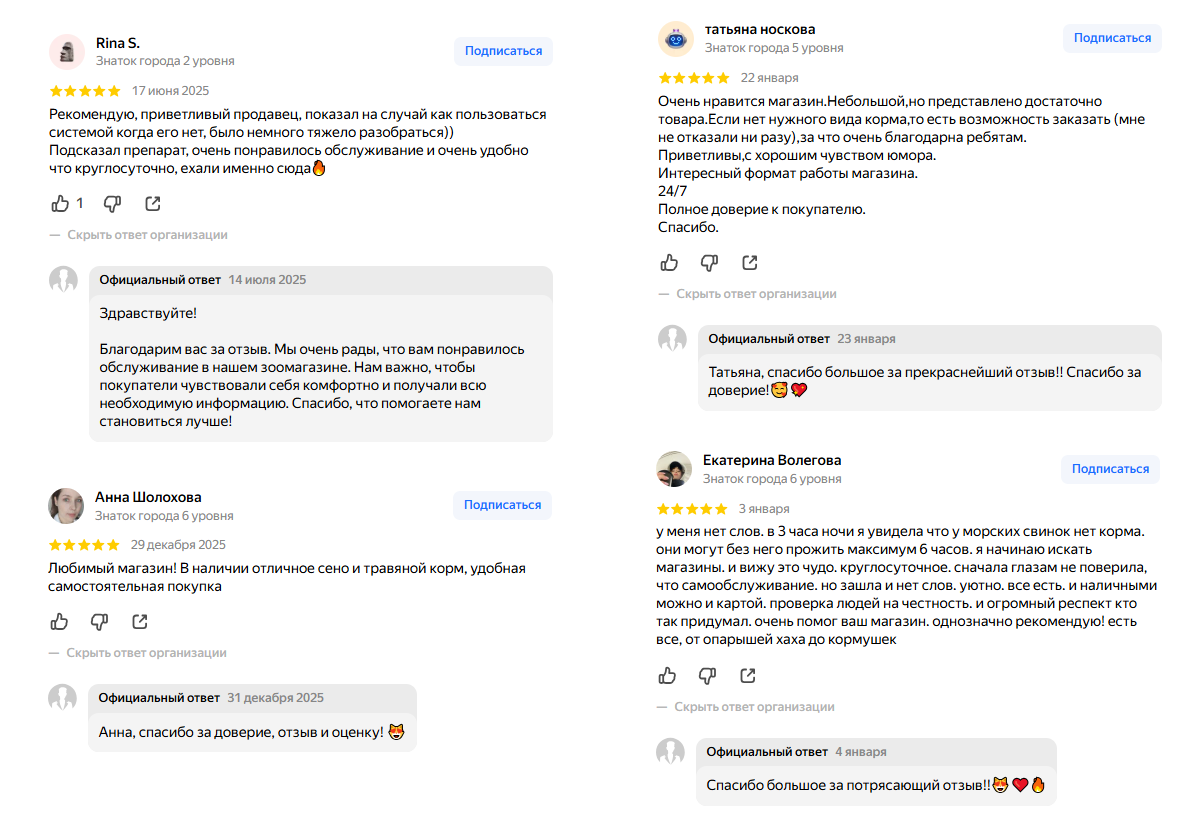Несмотря на то, что мы не вкладываемся в рекламу, в домовом чате я порой вижу, как люди советуют магазин соседям. Но, думаю,что большинство «ночных» клиентов всё же приходят из геосервисов: люди видят, что все зоомагазины закрыты и только мы работаем — и приезжают. Иногда даже специально едут из Москвы.
