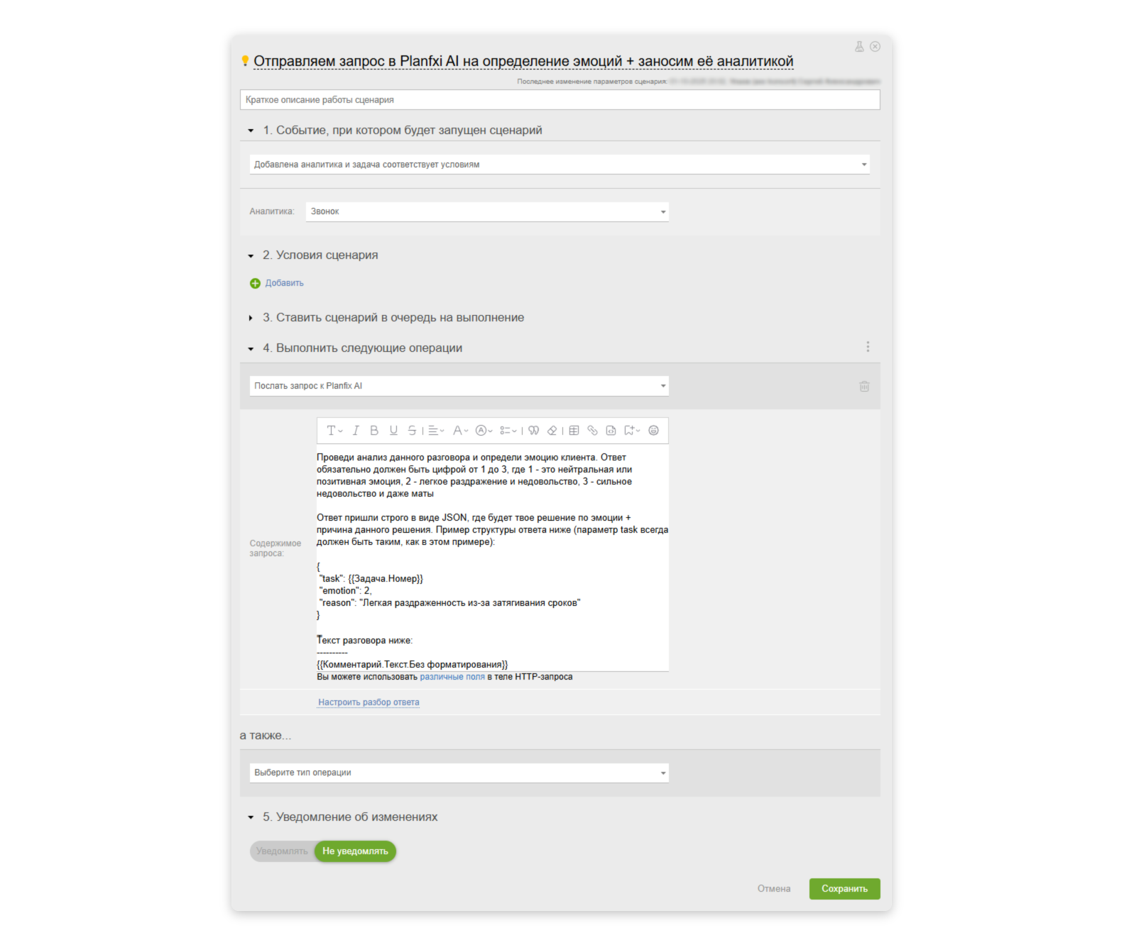 Planfix AI помогает оценивать эмоции клиентов в разговоре с менеджером. Для этого нужно добавить специальный вебхук и прописать сценарий. ИИ будет анализировать разговоры и генерировать отчёты по каждому звонку.