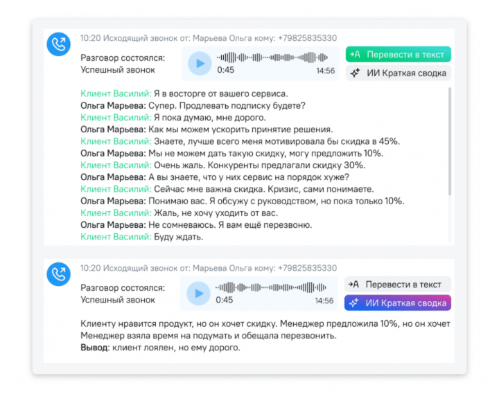 Транскрибация и саммари звонков. ИИ умеет переводить запись разговоров в текст. Это удобно: не нужно переслушивать диалог с клиентом, достаточно прочитать текст. Также ИИ умеет делать из большого текста краткую сводку, чтобы быстро передать суть диалога.