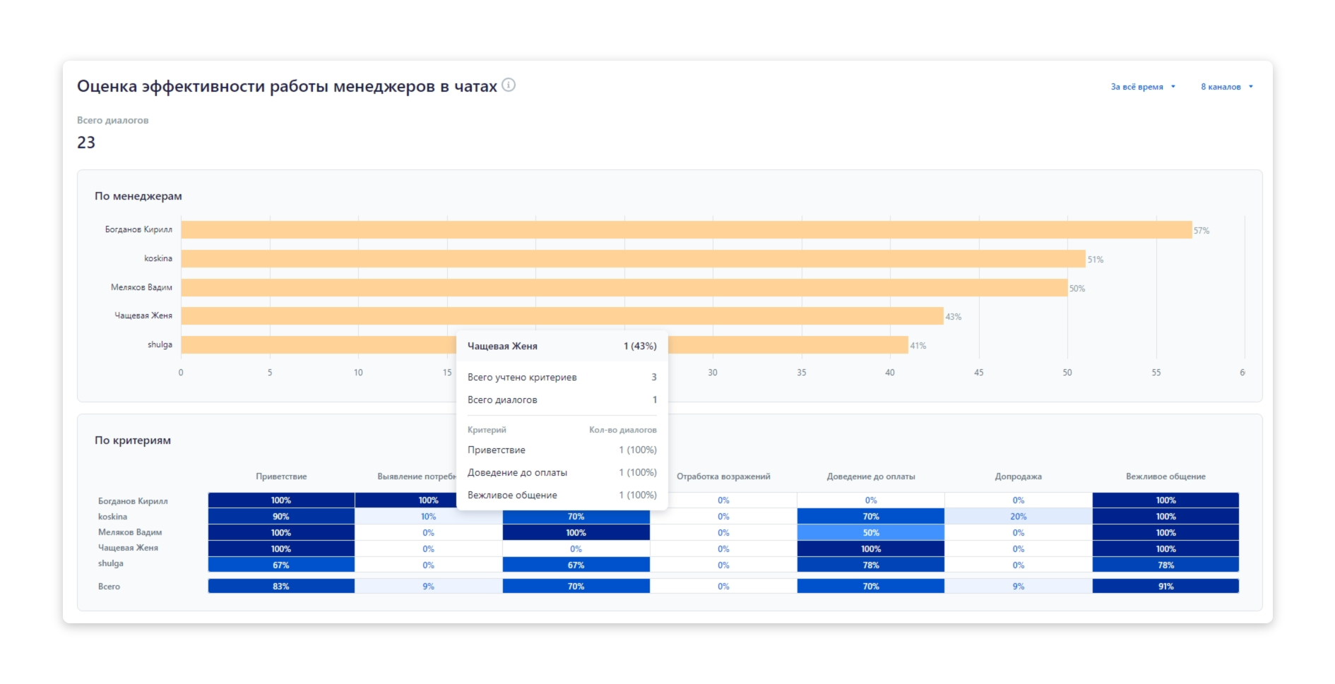 Также в EnvyCRM есть статистика по работе менеджеров. Анализ чатов совместно со статистикой поможет понять, кто умеет работать с клиентами, а кто — нет.