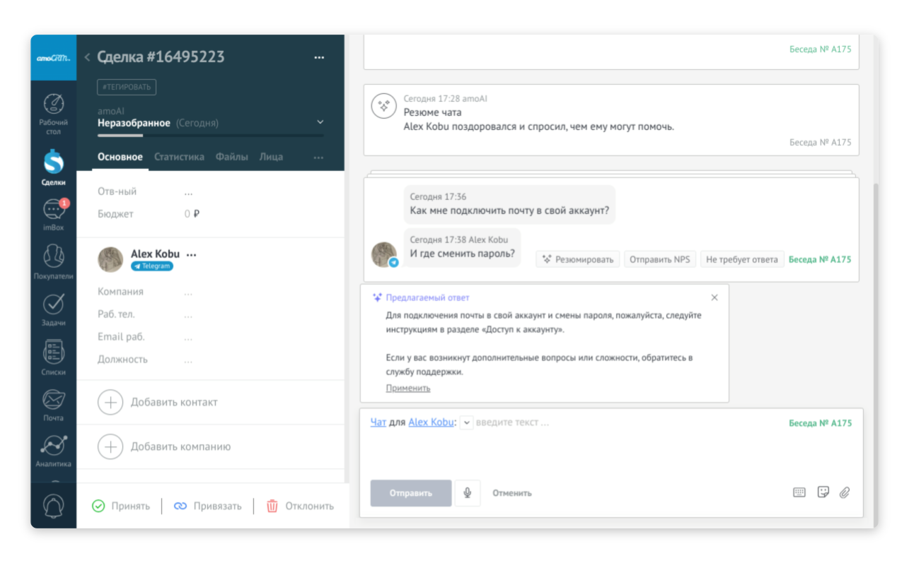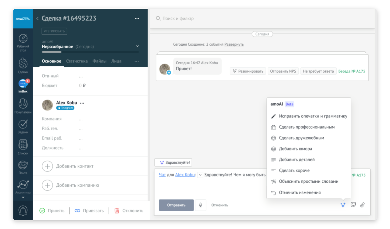 В amoCRM разработали умного помощника amoAI. Он умеет работать с текстом: найдёт и исправит ошибки, поменяет тональность, сократит или добавит детали. Эта функция подходит для общения с клиентами или партнёрами.