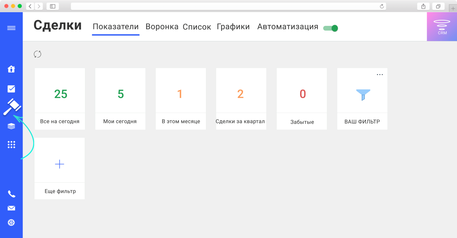 Воронка продаж. Модуль визуализирует этапы работы с клиентами, в этих этапах лежат сделки. Менеджеры работают с клиентами внутри карточек сделок, перемещая их по этапам. Так проще контролировать продажи и не упускать клиентов.