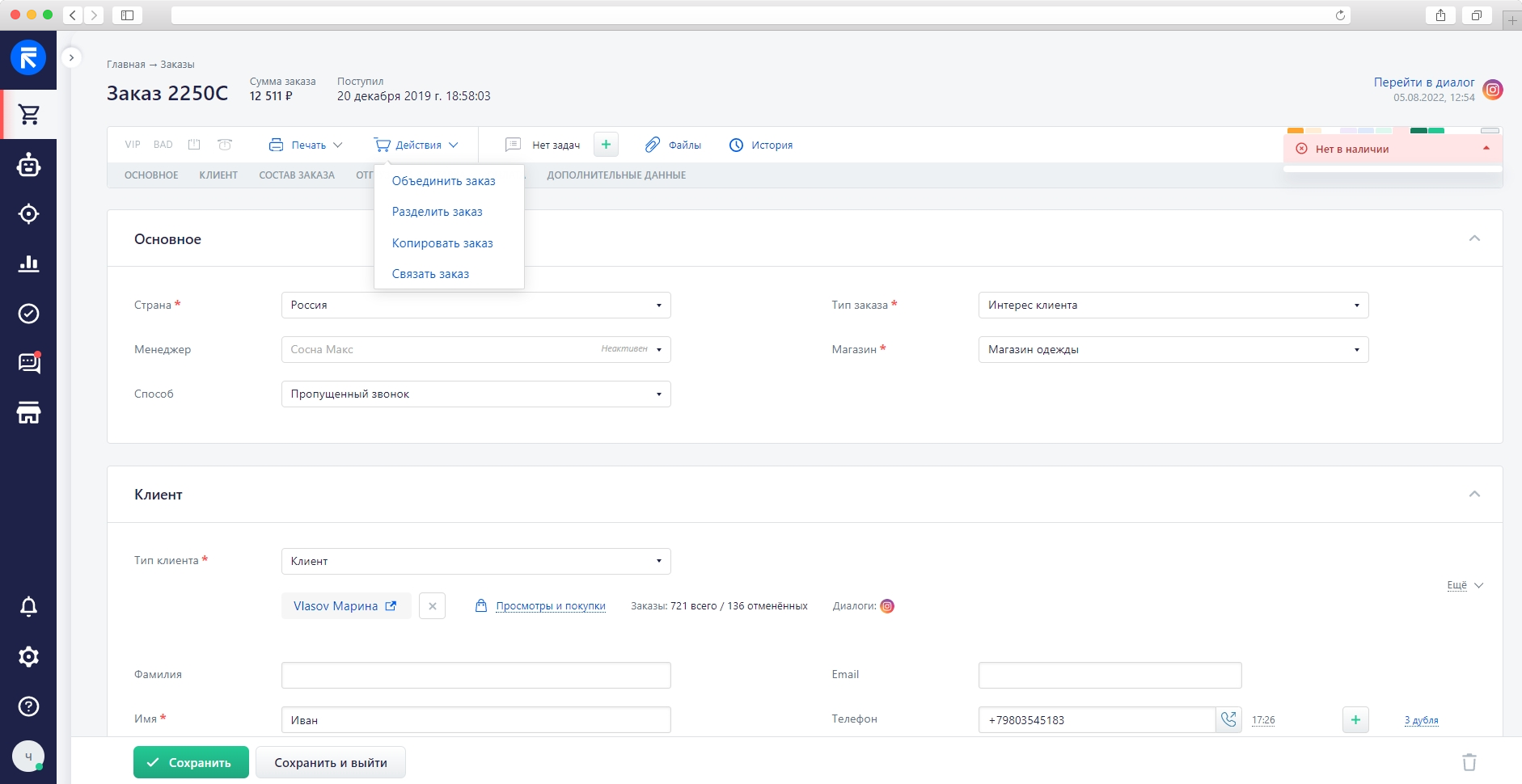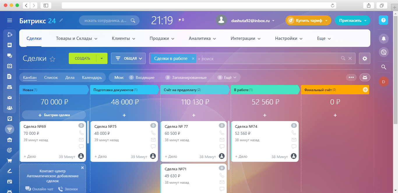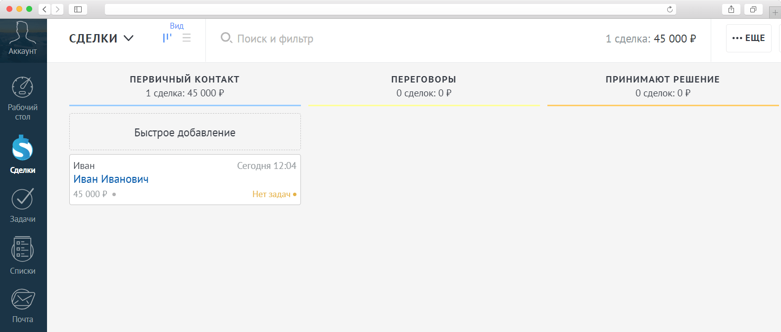 База контактов. В этом модуле хранят контактные данные клиентов и любую информацию о них. У каждого покупателя своя карточка, из которой можно быстро перейти в сделку или найти нужные данные.