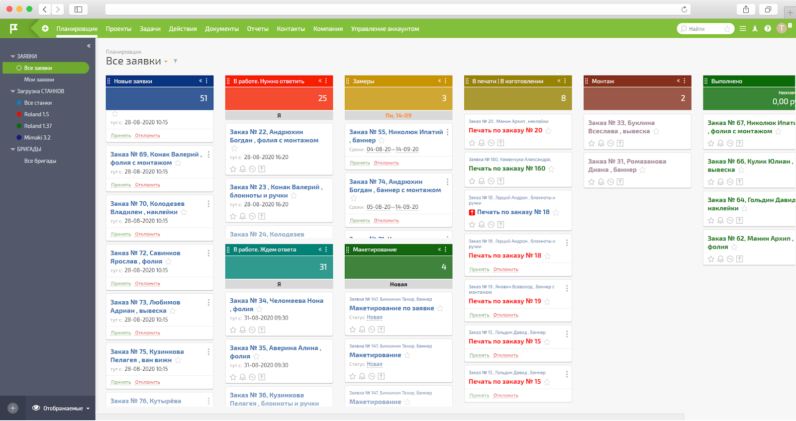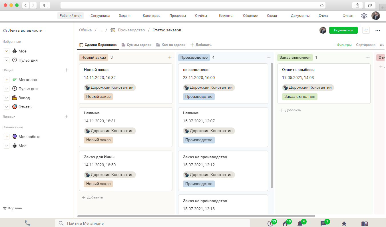Таск-менеджер. Сотрудникам часто нужно выполнять какие-то задачи по клиентам — их фиксируют в карточках сделок. Но ещё есть задачи по проектам и какие-то внутренние задачи. Их можно вести на канбан-досках. Например, в таск-менеджере удобно делать отчёты для клиентов. А ещё контролировать производство мебели или вести задачи по благоустройству офиса.