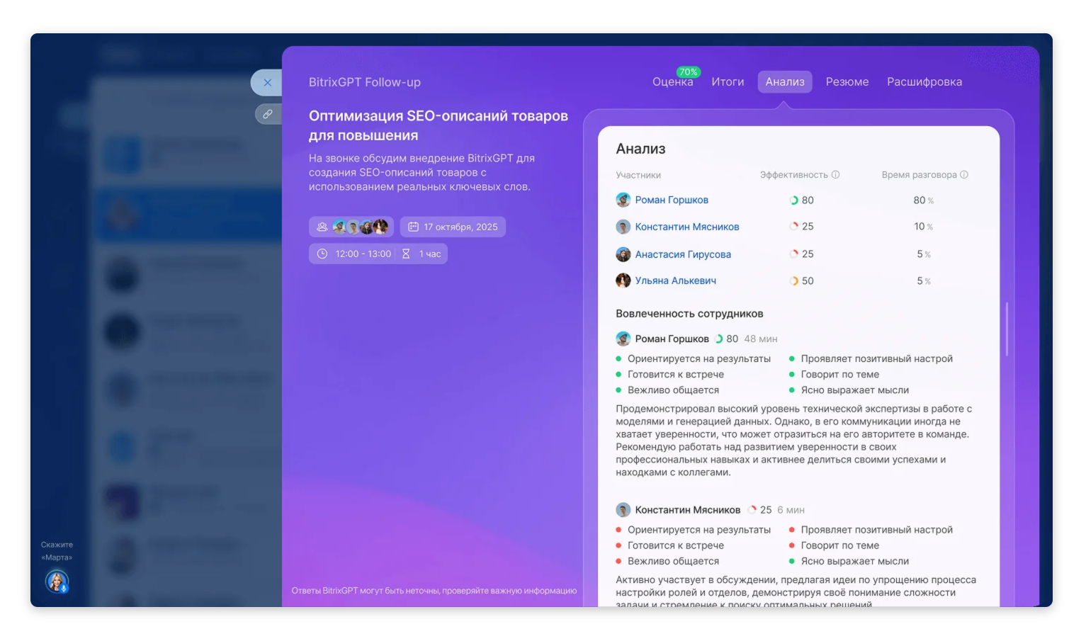 В Битрикс24 проще контролировать эффективность созвонов команды. ИИ проанализирует вовлечённость сотрудников по заданным параметрам. Ещё подведёт итоги беседы, сделает её транскрибацию.