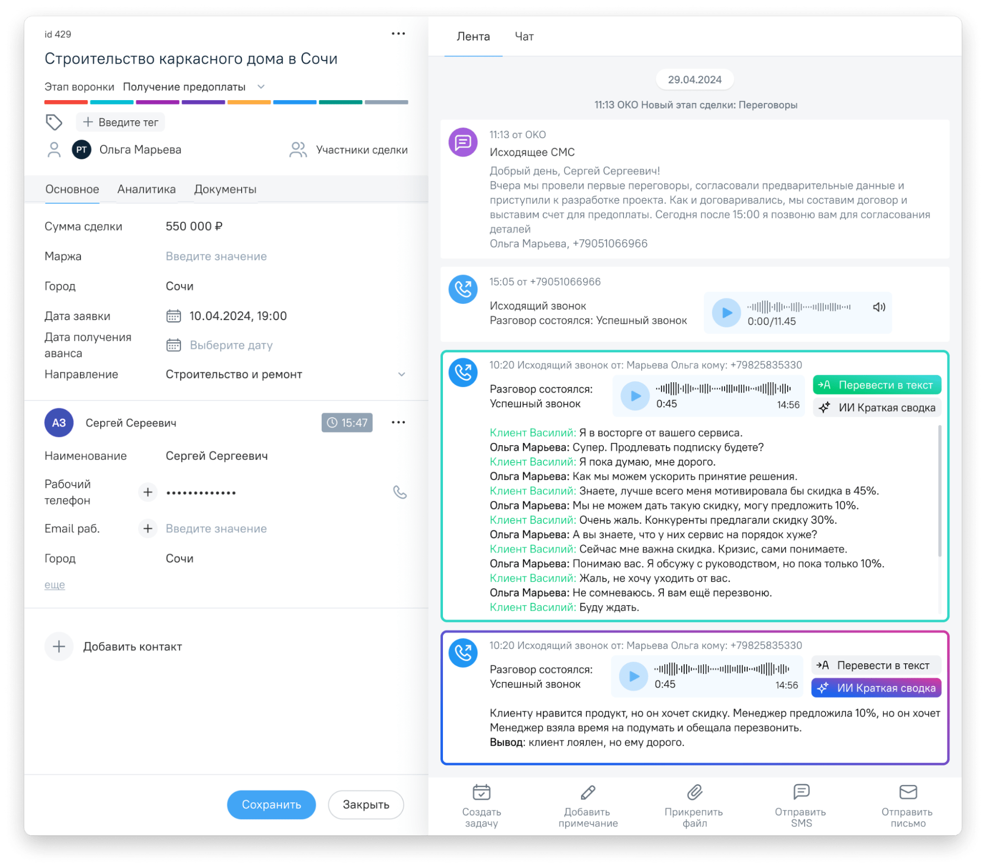Транскрибация и саммари записей разговоров. Если сотрудники разговаривают с клиентами по телефону, в карточке сделки сохраняется запись разговора. Чтобы менеджер вспомнил детали, а руководитель понял суть, ИИ расшифровывает запись. Также алгоритм может кратко пересказать диалог.