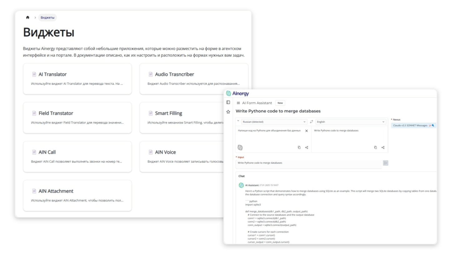 У SimpleOne есть продукт Ainergy. Это платформа, которая поможет выстроить бизнес-процессы с помощью ИИ. Ainergy подключается к CRM-системе и позволяет использовать готовые ИИ-виджеты.