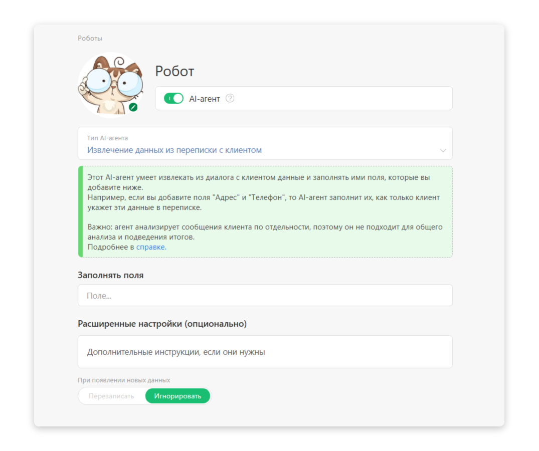 ИИ-агенты. Это виртуальные помощники, которые выполняют те задачи, под которые их настроили. Например, консультируют клиентов или заполняют карточки сделок. ИИ-агенты могут работать с информацией: сортировать письма или тегировать клиентов в зависимости от их интересов, упомянутых в диалоге с менеджером.