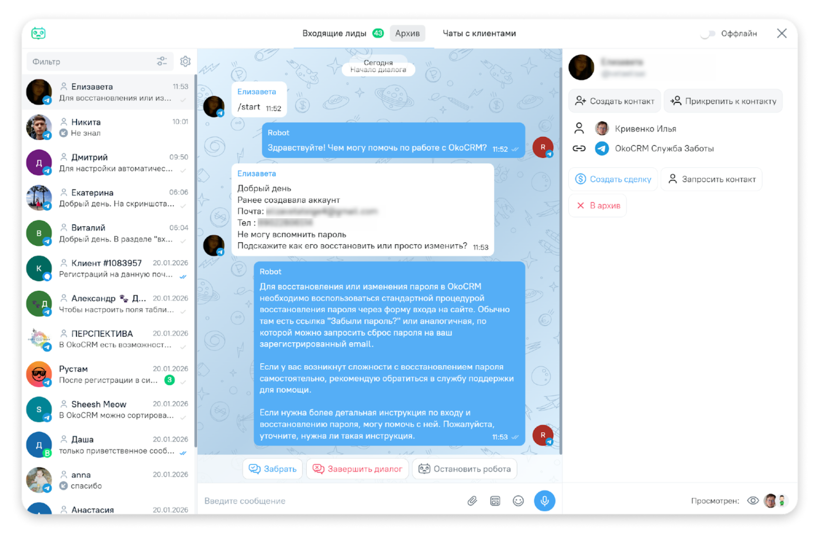 Конструктор чат-ботов. В OkoCRM есть готовые шаблоны ботов и конструктор, с помощью которых их можно настроить под себя. Такие чат-боты выполняют более простые действия, чем ИИ-агенты: отвечают на вопросы по сценарию или собирают контакты покупателей. ИИ-агенты умнее. Они берут на себя первичную коммуникацию с клиентами.