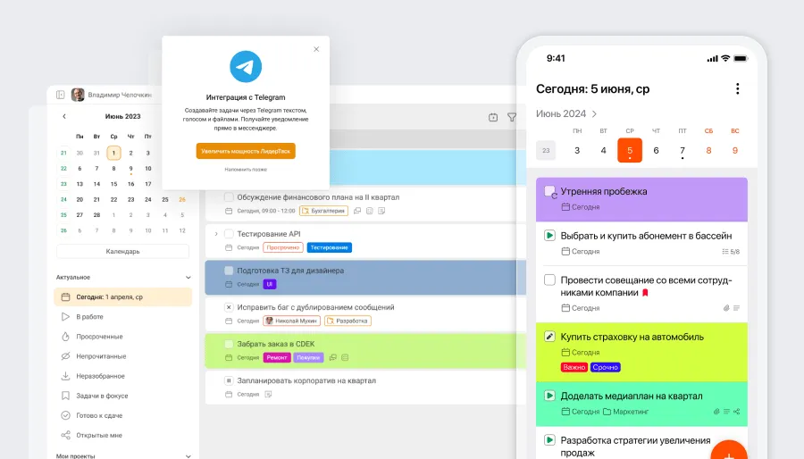 ЛидерТаск доступен в веб-версии, на Windows, iOS и Android, с кроссплатформенной синхронизацией.
