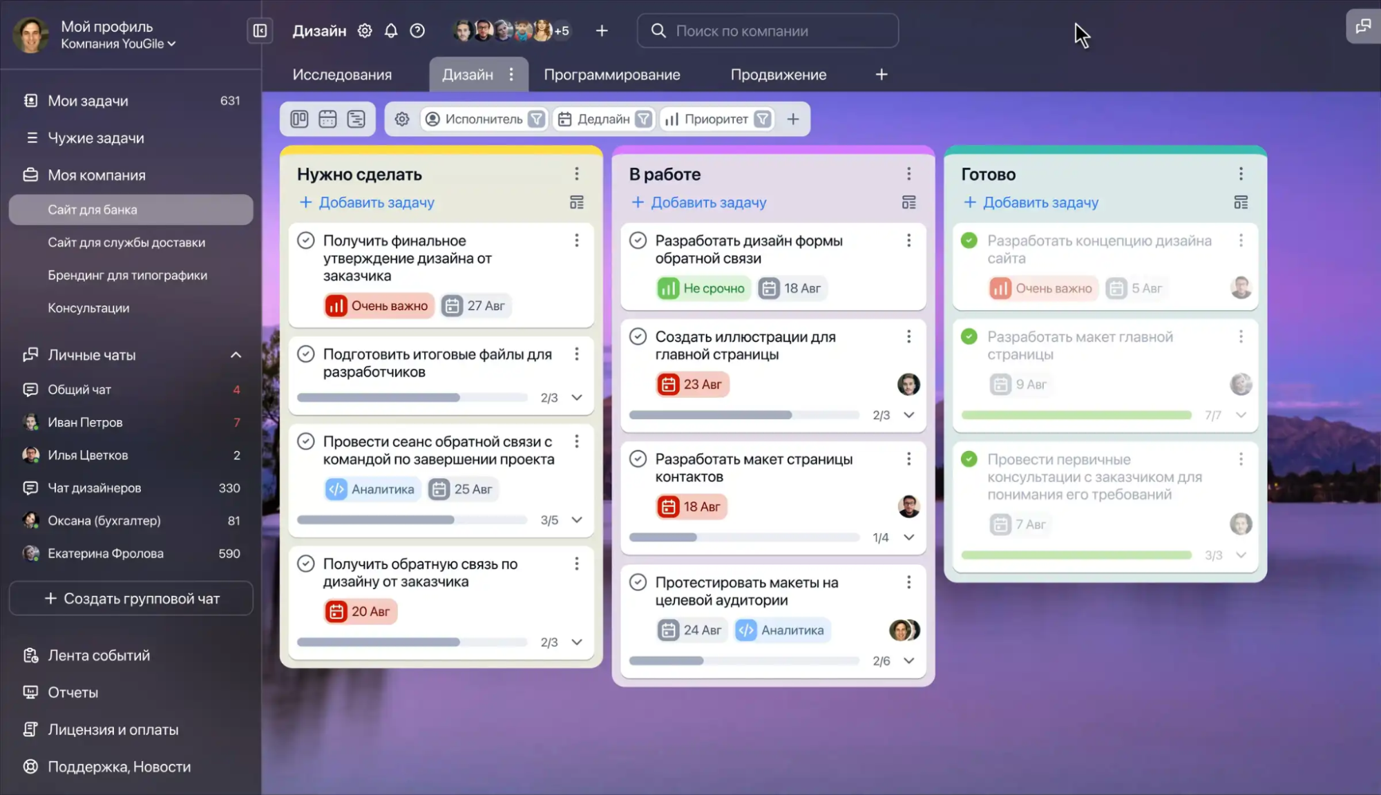 YouGile упрощает взаимодействие внутри команды за счёт встроенных чатов в задачах — вся коммуникация остаётся в контексте работы и не теряется. Сервис позволяет гибко настраивать процессы, распределять роли и права доступа, отслеживать выполнение задач и вести проекты в удобном визуальном формате. Подходит для команд, где важно много обсуждений и согласований.