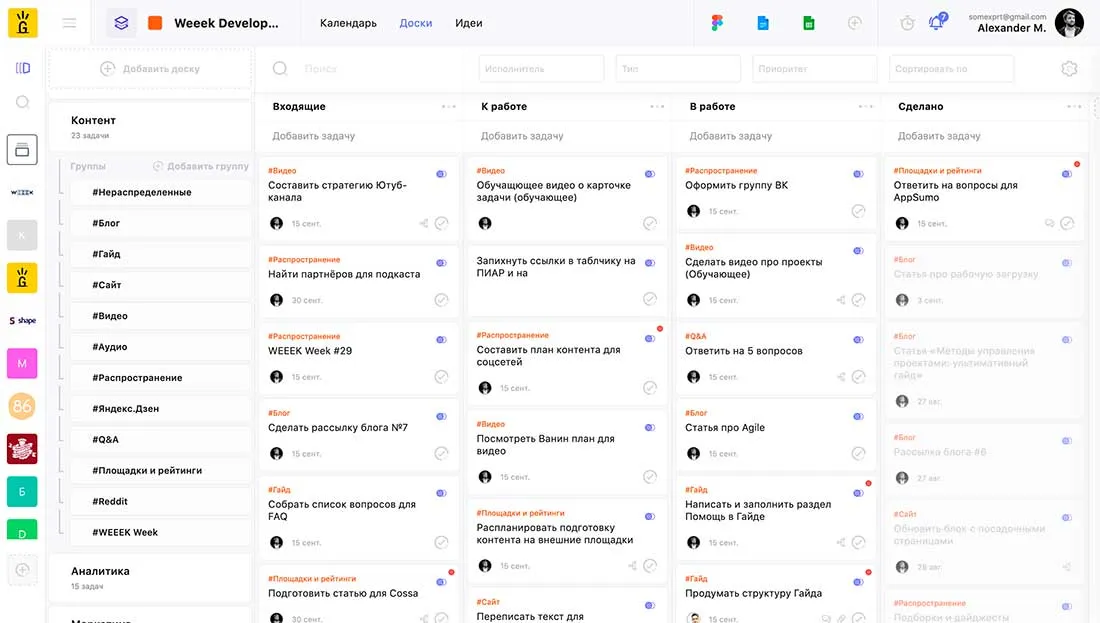 Внутри уже есть всё необходимое для ежедневной работы: канбан-доски, календарь, а также инструменты тайм-менеджмента, включая Pomodoro-таймер. Сервис построен вокруг принципа недельного планирования — задачи удобно распределять по дням и постепенно двигаться от одного блока работы к другому, сохраняя фокус и контроль над загрузкой.